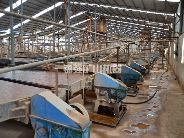 云錫式搖床設備是我國云南錫業機械制造有限公司對原蘇式CC-2型搖床進行改進而成,故也稱云錫選礦搖床。云錫式搖床床頭采用凸輪杠桿式,另一些則采用凸輪搖臂搖臂式簡化床頭。云錫選礦搖床設備床架較簡單,床面采用滑動支承方式。云錫式搖床床面與6S搖床面基本相同,不同于6S搖床在縱向上有若干個斜坡。磨床采用生漆、生漆(生漆與鍛石膏混合物)、玻璃鋼或聚氨酯作耐磨層,有粗砂床、細砂床、礦泥床3種。一般粗砂床上鋪梯形來復條,細砂床上鋪有鋸齒形復條,礦泥床面為三角形溝槽。